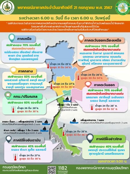 ผู้สื่อข่าวรายงานว่า กรมอุตุนิยมวิทยา พยากรณ์สภาพอากาศ 7 วันล่วงหน้าระหว่างวันที่ 21 – 27 กรกฎาคม พ.ศ. 2567ในวันที่ 21 ก.ค. 67 ร่องมรสุมพาดผ่านตอนบนของภาคเหนือ ภาคตะวันออกเฉียงเหนือตอนบน ประเทศลาวตอนบน และประเทศเวียดนามตอนบน ประกอบกับมรสุมตะวันตกเฉียงใต้กำลังปานกลางพัดปกคลุมทะเลอันดามัน ประเทศไทย และอ่าวไทย