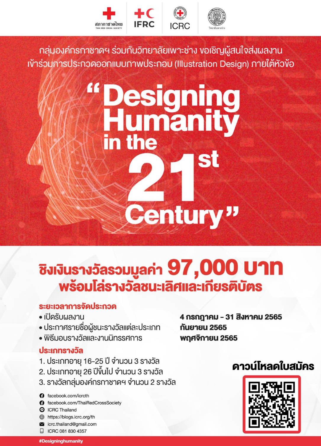 คณะกรรมการกาชาดระหว่างประเทศ (International Committee of the Red Cross – ICRC) หรือ ไอซีอาร์ซี ร่วมกับ สภากาชาดไทย (Thai Red Cross Society – TRCS) สหพันธ์สภากาชาดและสภาเสี้ยววงเดือนแดงระหว่างประเทศ (International Federation of Red Cross and Red Crescent Societies – IFRC) และ วิทยาลัยเพาะช่าง เชิญนักศึกษาและประชาชนทั่วไป ส่งผลงานออกแบบภาพประกอบเข้าประกวดภายใต้หัวข้อ “Designing Humanity in the 21st Century” ชิงเงินรางวัล พร้อมโล่รางวัลชนะเลิศและเกียรติบัตร โดยเปิดรับสมัครตั้งแต่วันนี้ถึง 31 สิงหาคม 2565