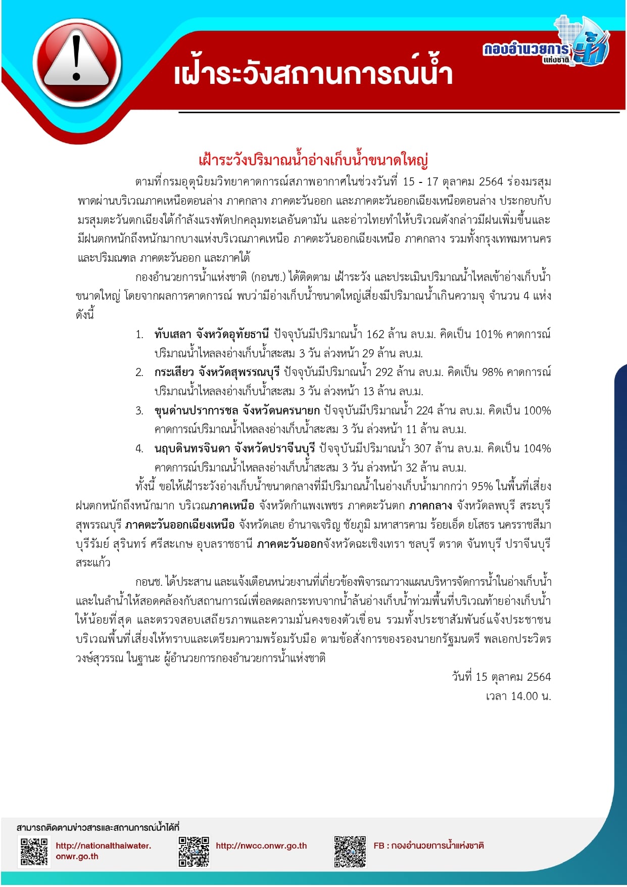 - อ่างฯขุนด่านปราการชล จ.นครนายก ปริมาณน้ำ 224 ล้าน ลบ.ม. คิดเป็น 100% ของความจุ คาดการณ์น้ำไหลลงอ่างฯเพิ่มขึ้น 11 ล้าน ลบ.ม.