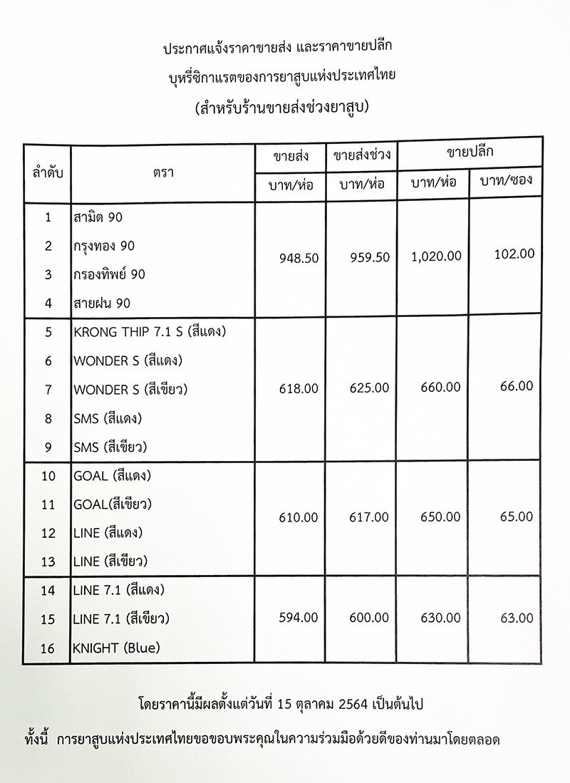 ผู้สื่อข่าวรายงานว่า ร้านค้าปลีก โชห่วย และร้านสะดวกซื้อ เตรียมขึ้นราคาขายปลีกบุหรี่ ตั้งแต่วันที่ 18 ต.ค.นี้ เป็นต้นไป หลังกรมสรรพสามิตได้เห็นชอบราคาใหม่เรียบร้อยแล้วตั้งแต่ 15 ต.ค.ที่่ผ่านมา โดยราคาบุหรี่ใหม่ ของการยาสูบแห่งประเทศไทยจะปรับขึ้น ดังนี้ บุหรี่ซองละ 55 บาท ขึ้นเป็น 63 บาท ซอง 60 บาท ขึ้นเป็น 66 บาท ราคาซอง 95 บาท เป็น 102 บาท ขณะที่บุหรี่นำเข้าต่างประเทศจะขึ้นราคาหลังจากนั้น คาดช่วง 1 พ.ย.64 เนื่องจากยังมีสต็อกเก่าเหลืออยู่ โดยราคาซอง 60 บาท จะขึ้นเป็น 68-72 บาท แต่กลุ่มบุหรี่แพง 150 บาท คงขายราคาเดิม