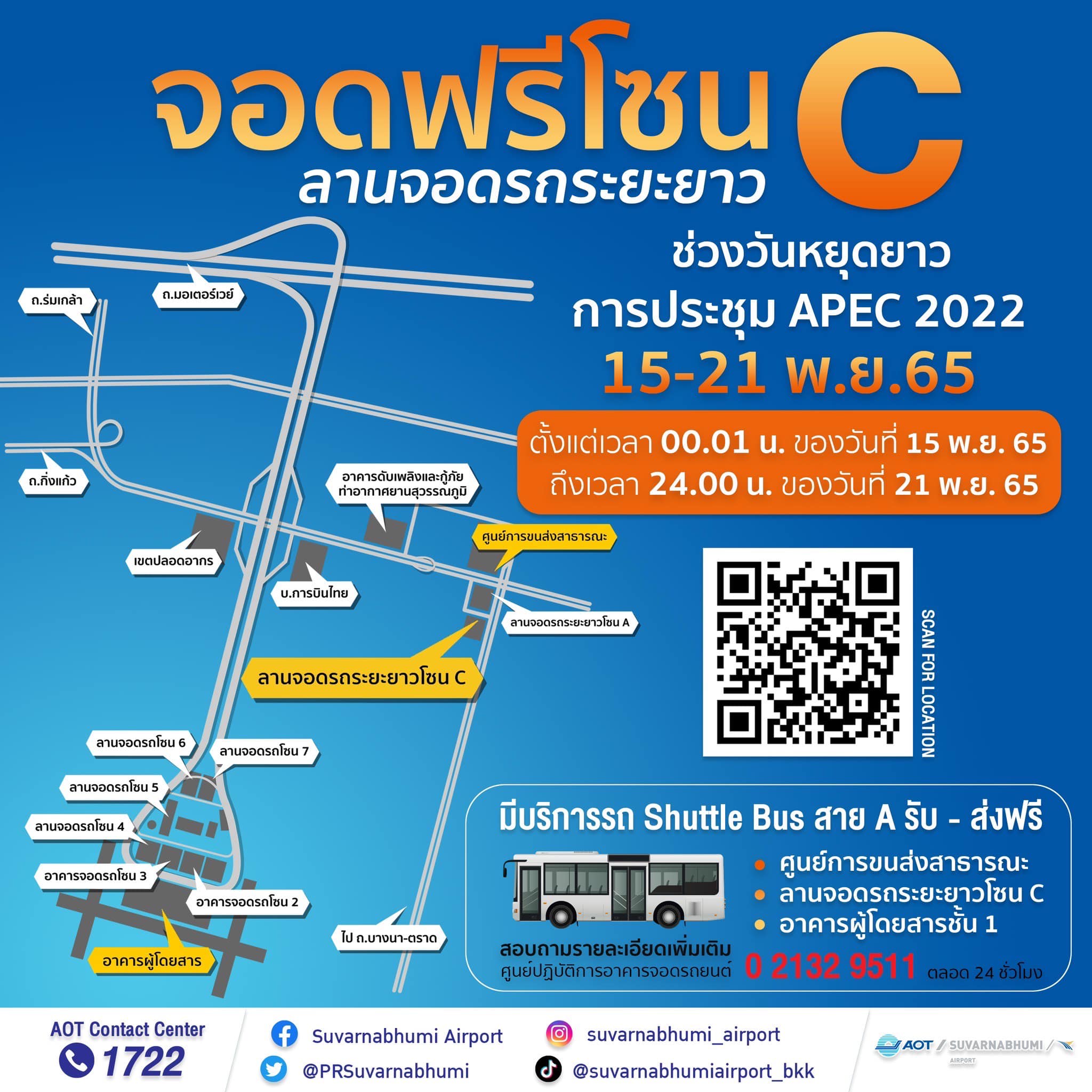 ท่าอากาศยานสุวรรณภูมิเปิดให้ผู้โดยสาร ผู้ใช้บริการ จอดรถฟรี 7 วัน ณ ลานจอดรถระยะยาวโซน C  15 – 21 พ.ย.2565 ช่วงการประชุม APEC 2022 Thailand