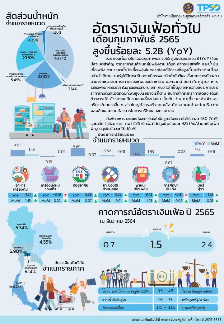 นายรณรงค์ พูลพิพัฒน์ ผู้อำนวยการสำนักงานนโยบายและยุทธศาสตร์การค้า (สนค.) เผยว่า ดัชนีราคาผู้บริโภคของไทยเดือนก.พ.65 อยู่ที่ 104.10 เพิ่มขึ้น 5.28% เมื่อเทียบกับเดือนก.พ.64 ทำให้เงินเฟ้อเฉลี่ย 2 เดือน (ม.ค.-ก.พ.) 65 เพิ่มขึ้น 4.25% ขณะที่เงินเฟ้อพื้นฐาน ที่หักอาหารสดและพลังงานออก ออกจากการคำนวณ สูงขึ้น 1.80% เมื่อเทียบกับเดือนก.พ.64