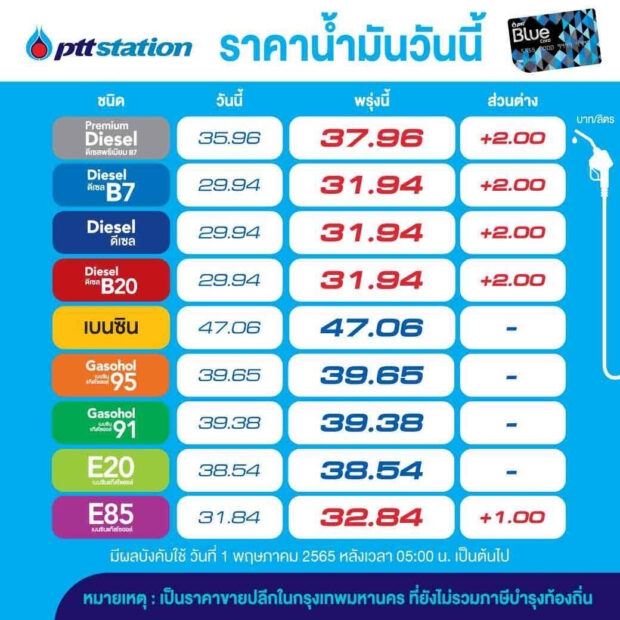 ผู้สื่อข่าวรายงานว่า สถานีบริการน้ำมันพีทีที สเตชั่น และสถานีบริการน้ำมันบางจาก ได้ประกาศปรับขึ้นราคาน้ำมันดีเซลลิตรละ 2 บาท และปรับขึ้นแก๊สโซฮอล์อี 85 อีกลิตรละ 1 บาท มีผลวันพรุ่งนี้ (1 พ.ค.) มีผลตั้งแต่ 05.00 น. เป็นไปตามมาตรการของคณะกรรมการบริหารกองทุนน้ำมันเชื้อเพลิง (กบน.) ที่มีมติเห็นชอบแนวทางลดการช่วยอุดหนุน การปรับราคาน้ำมันดีเซล เป็นขั้นบันได ตั้งแต่วันที่ 1 พ.ค. 65 ส่วนน้ำมันประเภทอื่นคงเดิม