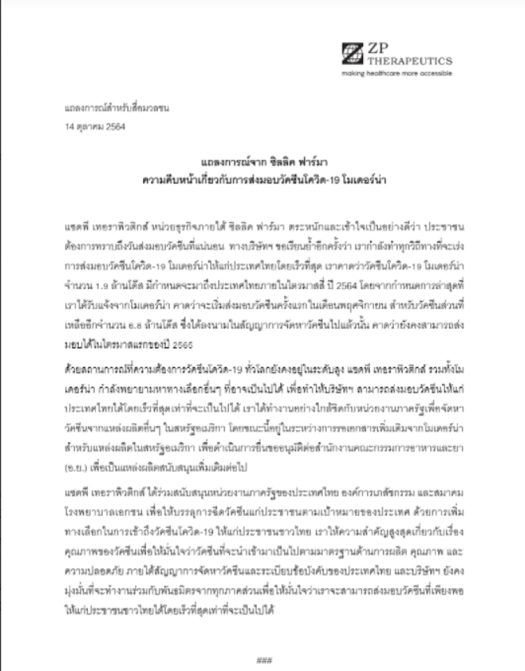 เมื่อวันที่ 23 ตุลาคม 2564 ผู้สื่อข่าวรายงานว่า ซิลลิค ฟาร์มา ได้ออกแถลงการณ์ความคืบหน้า การส่งมอบวัคซีนโควิด-19 โมเดอร์นา แก่ประเทศไทย โดยมีใจความว่า แซดพี เทอราพิวติกส์ หน่วยธุรกิจภายใต้ ซิลลิค ฟาร์มา พันธมิตรทางธุรกิจอย่างเป็นทางการของโมเดอร์น่าในประเทศไทย ขอแจ้งให้ทราบว่า ตามกำหนดการล่าสุดที่ได้รับการยืนยันว่าจะจัดส่งวัคซีน โมเดอร์น่า จำนวน 560,000 โดส ถึงประเทศไทยไม่เกินวันที่ 5 พฤศจิกายน 2564 โดยบริษัทฯ ได้เตรียมความพร้อมในทุกๆ ด้านเพื่อรองรับการขนส่งและการกระจายวัคซีนทันทีที่วัคซีนมาถึงประเทศไทยแล้ว