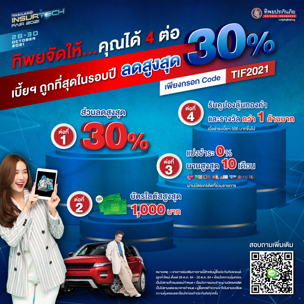 ทิพยประกันภัย จัดเต็มโปรโมชันครบที่สุด ดีที่สุด เบี้ยประกันถูกที่สุดในรอบปี เพื่อลูกค้า พร้อมยกทัพผลิตภัณฑ์ประกันภัยมากมาย ในงาน Thailand InsurTech Fair (TIF) 2021 ซึ่งงานดังกล่าวจะจัดในรูปแบบ Digital Virtual Event ตอบสนอง Lifestyle เพื่อความสะดวกสบาย เลือกซื้อผลิตภัณฑ์ประกันภัยในงาน ได้อย่างง่ายดายเพียงแค่ปลายนิ้ว โดยทิพยประกันภัยจัดให้คุณ…..ได้ถึง 4 ต่อ