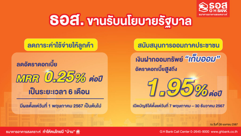 ธอส. ขานรับนโยบายรัฐบาล ลดอัตราดอกเบี้ย MRR 0.25% ต่อปี พร้อมส่งเสริมวินัยการออม ด้วย “เงินฝากออมทรัพย์เก็บออม” ดอกเบี้ยสูงถึง 1.95% ต่อปี