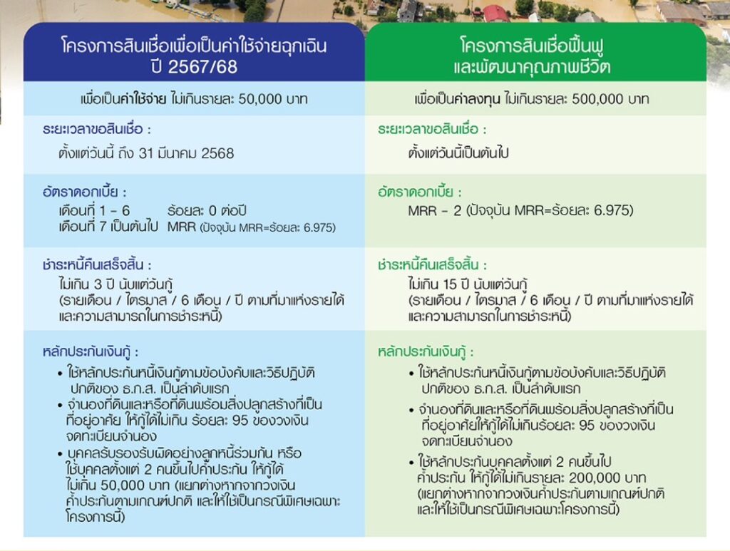 - โครงการสินเชื่อฟื้นฟูและพัฒนาคุณภาพชีวิต เพื่อเป็นค่าลงทุนในการซ่อมแซมบ้านเรือนและทรัพย์สิน ค่าซ่อมเครื่องมือและอุปกรณ์การเกษตรที่ได้รับความเสียหาย ค่าใช้จ่ายในการทำการเกษตรรอบใหม่ วงเงินรายละไม่เกิน 500,000 บาท อัตราดอกเบี้ย MRR-2
