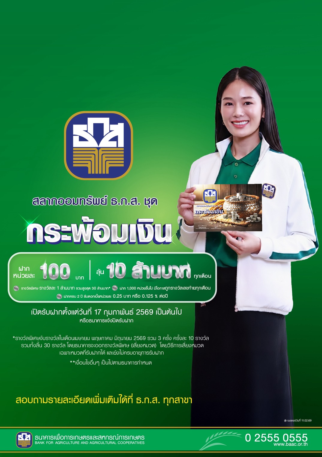 ธ.ก.ส. เปิดตัวซีรีส์ “สลากออมทรัพย์ ธ.ก.ส.” รับความรวยในเทศกาลตรุษจีน 2569 ในชุดกระพ้อมทอง หน่วยละ 500 บาท ให้ลุ้นโชคใหญ่ 20 ล้านบาท และรางวัลอื่น ๆ รวมมูลค่ากว่า 86 ล้านบาทต่อเดือน จำนวน 24 ครั้ง เมื่อฝากครบ 2 ปี ได้รับดอกเบี้ยหน่วยละ 3 บาท และชุดกระพ้อมเงิน หน่วยละ 100 บาท ลุ้นรางวัลใหญ่ 10 ล้านบาท ที่มาพร้อมรางวัลพิเศษอีกรางวัลละ 1 ล้านบาท ปีละ 3 ครั้ง รวม 30 ล้านบาท และรางวัลอื่น ๆ รวมมูลค่ากว่า 109 ล้านบาทต่อเดือน จำนวน 24 ครั้ง ฝากครบ 2 ปี รับดอกเบี้ยหน่วยละ 0.25 บาท เงินรางวัลได้รับการยกเว้นภาษีสำหรับบุคคลธรรมดา เปิดรับฝากตั้งแต่วันนี้เป็นต้นไป ผ่านแอปพลิเคชัน BAAC Mobile และ ธ.ก.ส. ทุกสาขา