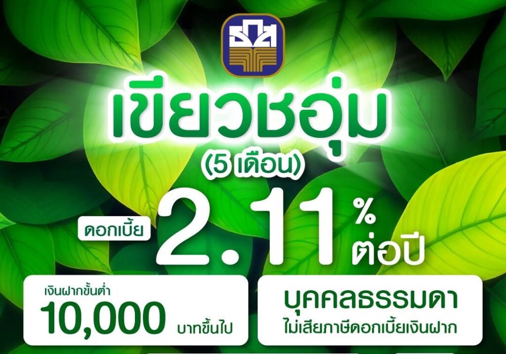 ธ.ก.ส. เปิดตัวโครงการเงินฝากออมทรัพย์พิเศษ “เงินฝากเขียวชอุ่ม” วงเงิน 10,000 ล้านบาท ระยะเวลาฝาก 5 เดือน รับดอกเบี้ยสูงถึง 2.11% ต่อปี เปิดจองสิทธิ์ 25 ต.ค. – 4 พ.ย. นี้