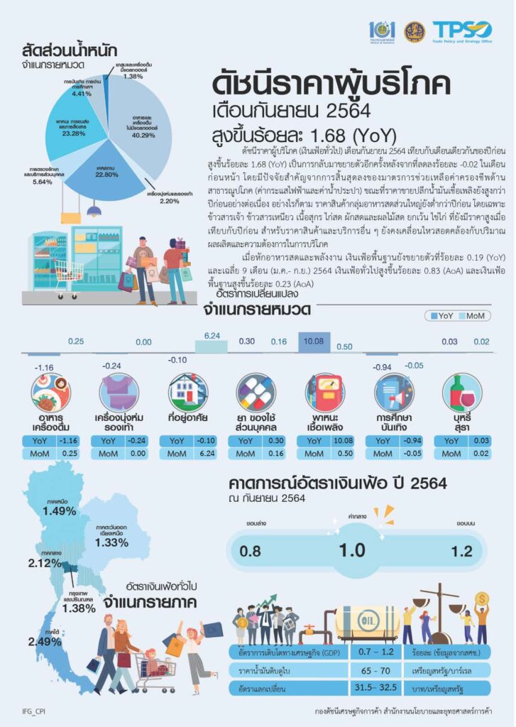 นายวิชานัน นิวาตจินดา รองผู้อำนวยการสำนักงานนโยบายและยุทธศาสตร์การค้า (สนค.) เปิดเผยว่า ดัชนีราคาผู้บริโภค (เงินเฟ้อทั่วไป) เดือนก.ย.64 เท่ากับ 101.21 เพิ่มขึ้น 1.59% เมื่อเทียบกับเดือนส.ค.64 และเพิ่มขึ้น 1.68% เมื่อเทียบกับก.ย.63 โดยกลับมาขยายตัวอีกครั้งหลังจากติดลบเมื่อเดือนก่อน ส่งผลให้เงินเฟ้อเฉลี่ย 9 เดือนของปี 64 (ม.ค.-ก.ย.) เพิ่มขึ้น 0.83% ขณะที่เงินเฟ้อพื้นฐานที่หักอาหารสดและพลังงานที่มีความผันผวนด้านราคาออก พบว่าดัชนีอยู่ที่ 100.59 เพิ่มขึ้น 0.16% เมื่อเทียบกับเดือนส.ค.64 เพิ่มขึ้น 0.19% เมื่อเทียบกับเดือนก.ย.63 และเฉลี่ย 9 เดือน เพิ่มขึ้น 0.23%
