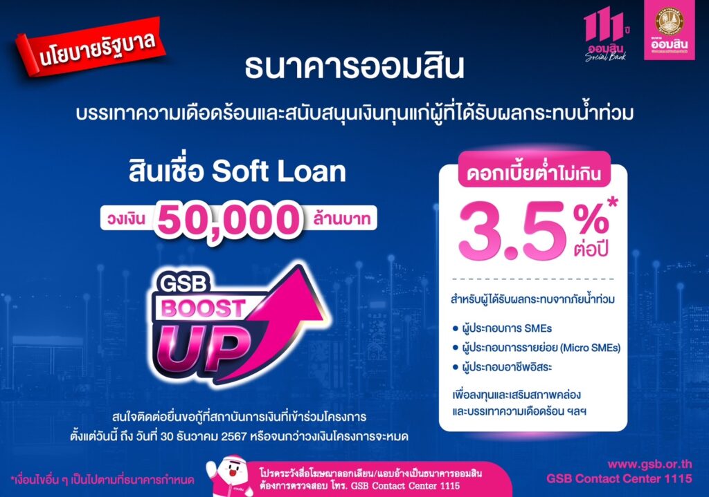 • จัดสรรวงเงินจำนวน 50,000 ล้านบาท ภายใต้โครงการสินเชื่อดอกเบี้ยต่ำ (Soft Loan) GSB Boost Up เพื่อนำมาช่วยเหลือผู้ที่ได้รับผลกระทบจากสถานการณ์อุทกภัย โดยขยายกลุ่มเป้าหมายให้ครอบคลุมทั้งผู้ประกอบการ SMEs ผู้ประกอบการรายย่อย และผู้ประกอบอาชีพอิสระ โดยธนาคารออมสินสนับสนุนแหล่งเงินทุนดอกเบี้ยต่ำให้แก่สถาบันการเงินที่เข้าร่วมโครงการ ทั้งธนาคารพาณิชย์และสถาบันการเงินเฉพาะกิจในอัตราดอกเบี้ยร้อยละ 01 ต่อปี เป็นระยะเวลา 2 ปี