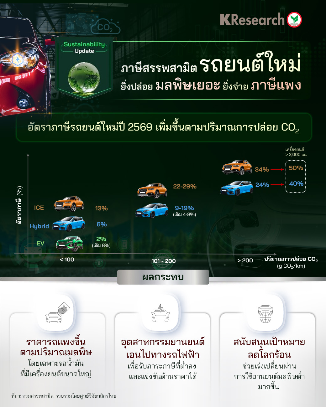 ด้านศูนย์วิจัยกสิกรไทย เปิดเผยว่า ในปี 2569 ผู้ซื้อรถยนต์ใหม่ที่ใช้น้ำมันต้องจ่ายภาษีแพงขึ้นอย่างน้อย 5,000 – 10,000 บาทต่อคัน และอาจสูงเป็นหลักแสนถึงหลักล้าน หากเป็นรถยนต์สันดาปภายในที่ปล่อยมลพิษเยอะ โดยเฉพาะรถน้ำมันที่มีเครื่องยนต์ขนาดใหญ่ เกิน 3 ลิตร