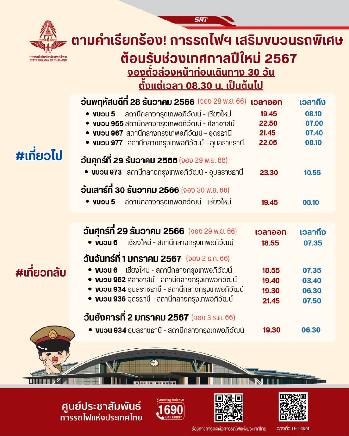 ทั้งนี้ สามารถสอบถามข้อมูลเพิ่มเติมที่ศูนย์บริการลูกค้าสัมพันธ์ หมายเลขโทรศัพท์ 1690 ตลอด 24 ชั่วโมง หรือเฟซบุ๊ก แฟนเพจ ทีมพีอาร์การรถไฟแห่งประเทศไทย