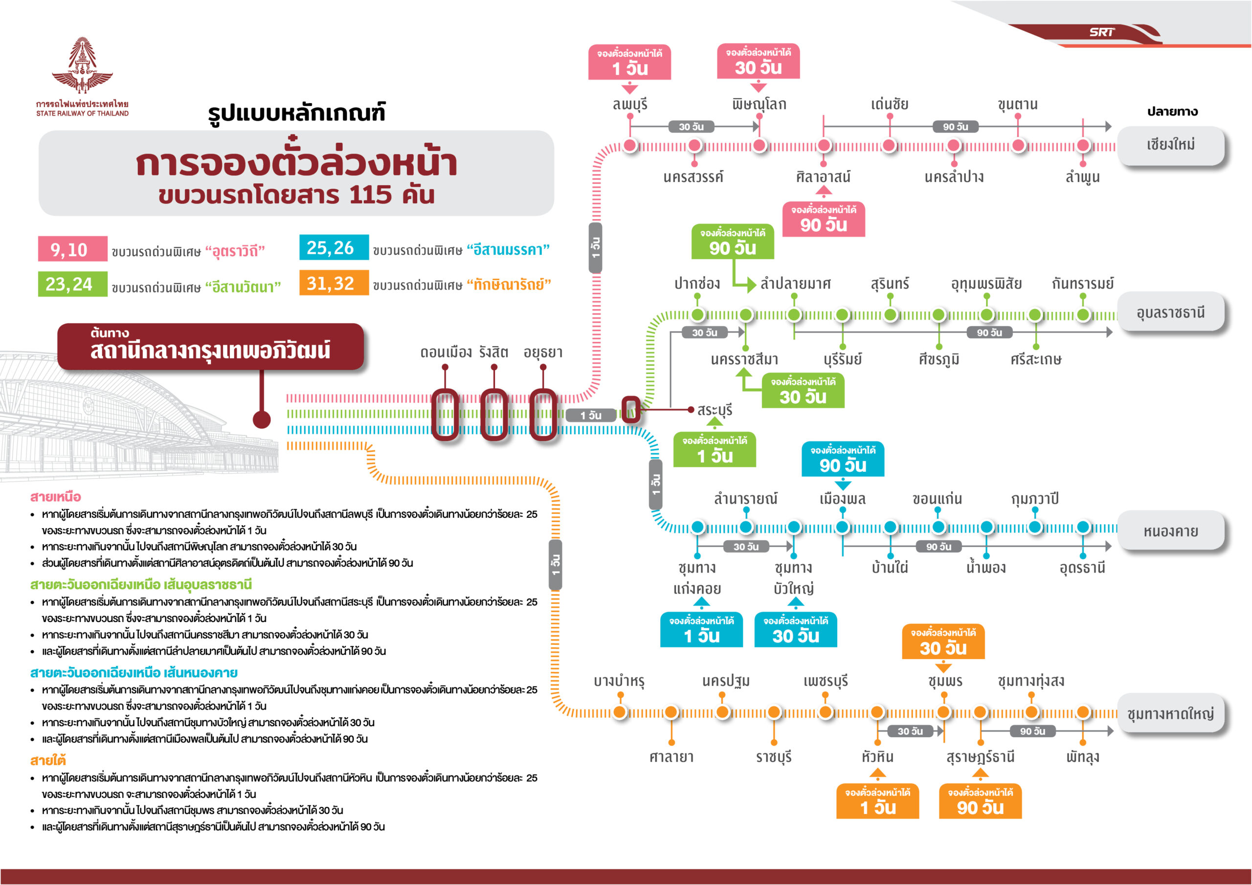 - ผู้โดยสารที่จองตั๋วเดินทางน้อยกว่าร้อยละ 25 ของระยะทางขบวนรถ จองตั๋วล่วงหน้าได้ 1 วัน
