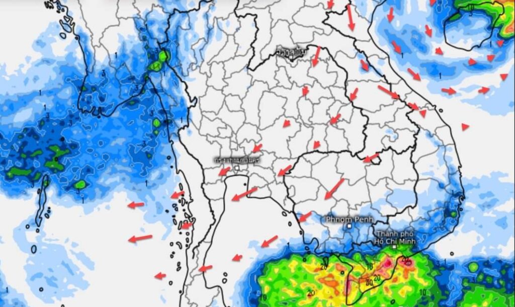 ส่วนในช่วงวันที่ 2 – 6 พ.ย. 65 บริเวณความกดอากาศสูงหรือมวลอากาศเย็นจากประเทศจีนอีกระลอกหนึ่งจะแผ่เสริมลงมาปกคลุมประเทศไทยตอนบน ทำให้ประเทศไทยตอนบนอุณหภูมิจะลดลงอีก 2 – 4 องศาเซลเซียสกับมีลมแรง สำหรับร่องมรสุมพาดผ่านบริเวณภาคใต้ตอนล่าง ทำ ให้ภาคใต้มีฝนตกต่อเนื่อง และมีฝนตกหนักบางแห่ง