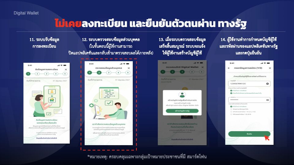 • การลงทะเบียนประชาชนกลุ่มที่ไม่มีสมาร์ตโฟน ขณะนี้อยู่ระหว่างเตรียมการให้เข้าร่วม โครงการฯ ได้ในระยะต่อไป โดยจะให้มีการลงทะเบียนและยืนยันตัวตนผ่านช่องทางที่กำหนด (ระหว่างวันที่ 16 กันยายน – 15 ตุลาคม 2567) ซึ่งจะต้องมีการตรวจสอบคุณสมบัติ สถานะบุคคล และที่อยู่ตามทะเบียนบ้าน  เช่นเดียวกับกลุ่มผู้มีสมาร์ตโฟน สำหรับส่วนของการใช้จ่ายนั้นอยู่ระหว่างการพิจารณาให้ใช้สิทธิผ่านบัตรประจำตัวประชาชน แต่การใช้สิทธิซื้อสินค้าจากร้านค้าจะทำได้ในวงแคบกว่าการใช้สิทธิของประชาชนกลุ่มที่มีสมาร์ตโฟน ดังนั้น การลงทะเบียนผ่านสมาร์ตโฟนจะสามารถใช้งานได้สะดวกกว่า จึงแนะนำให้พยายามลงทะเบียนผ่านทางสมาร์ตโฟนก่อนเป็นอันดับแรก