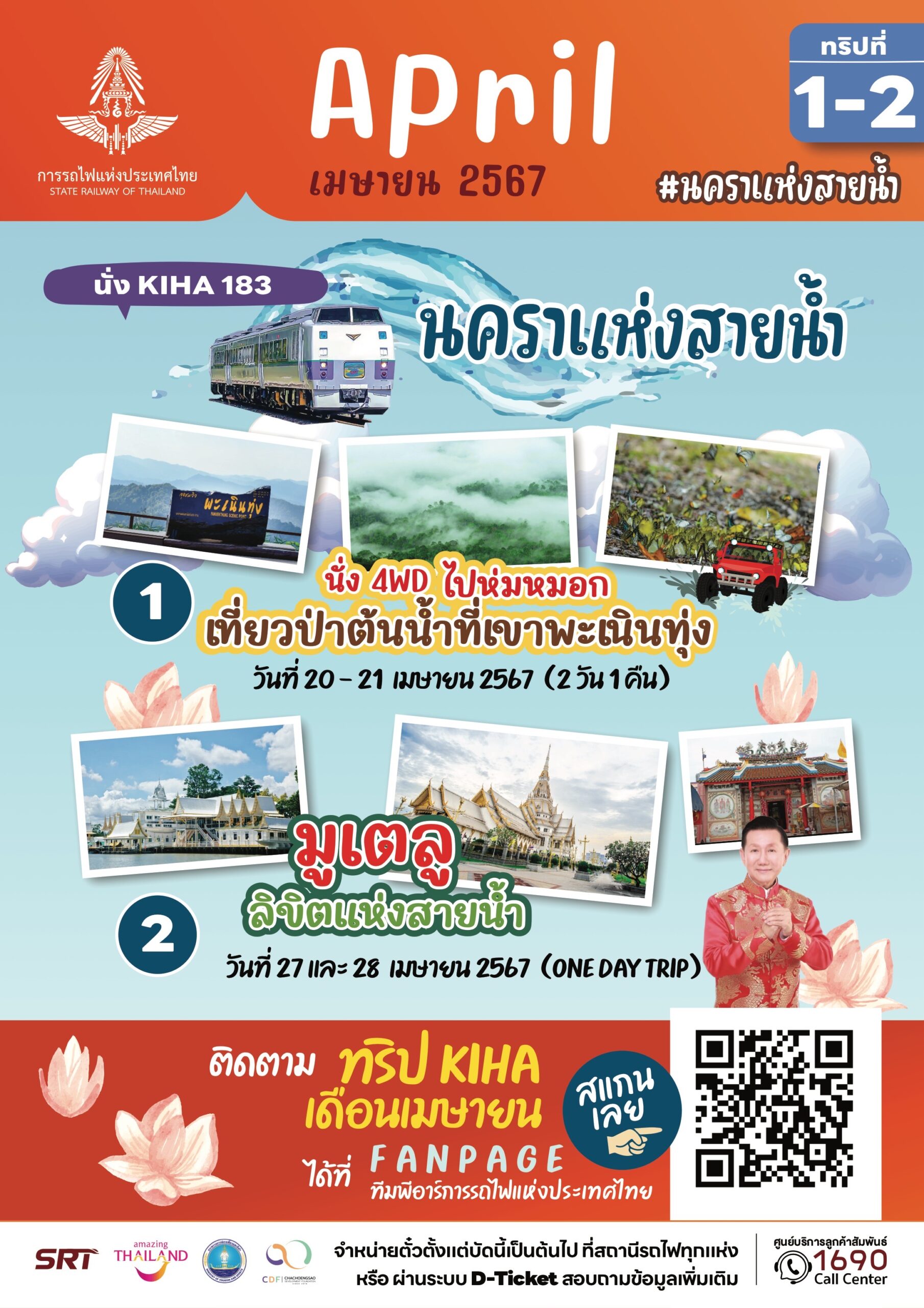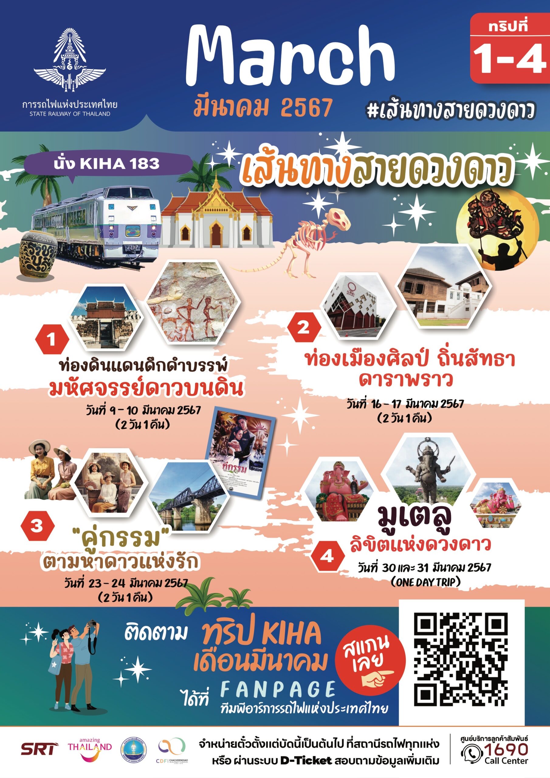 นายเอกรัช ศรีอาระยันพงษ์ หัวหน้าสำนักงานผู้ว่าการ การรถไฟแห่งประเทศไทย กล่าวว่า การรถไฟฯ เปิดทริปรถไฟท่องเที่ยวสุดพิเศษ ต้อนรับเดือนมีนาคม – เมษายน 2567 พานั่งขบวนรถ KIHA 183 ภายใต้คอนเซ็ปต์ เดือนมีนาคม #เส้นทางสายดวงดาว และเดือนเมษายน #นคราแห่งสายน้ำ เอาใจสายชิว สายมู สายธรรมชาติ สายผจญภัย ไปกับ 8 ทริป 4 เส้นทาง ทั้งแบบไปเช้ากลับเย็น หรือแบบพักค้างคืน ทุกวันเสาร์และอาทิตย์ เริ่มจำหน่ายตั๋วโดยสารพร้อมกันแล้ววันนี้ จำนวนจำกัด 202 ที่นั่งต่อวันเท่านั้น