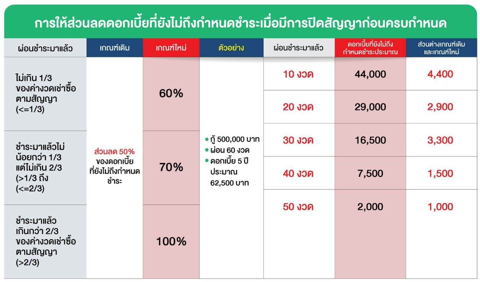 • กรณีผู้เช่าซื้อชำระค่างวดไม่เกิน 1 ใน 3 (<=1/3) ของค่างวดเช่าซื้อที่ระบุไว้ในสัญญา ให้ได้รับส่วนลดในอัตราไม่น้อยกว่า 60% ของดอกเบี้ยเช่าซื้อที่ยังไม่ครบกำหนดชำระ