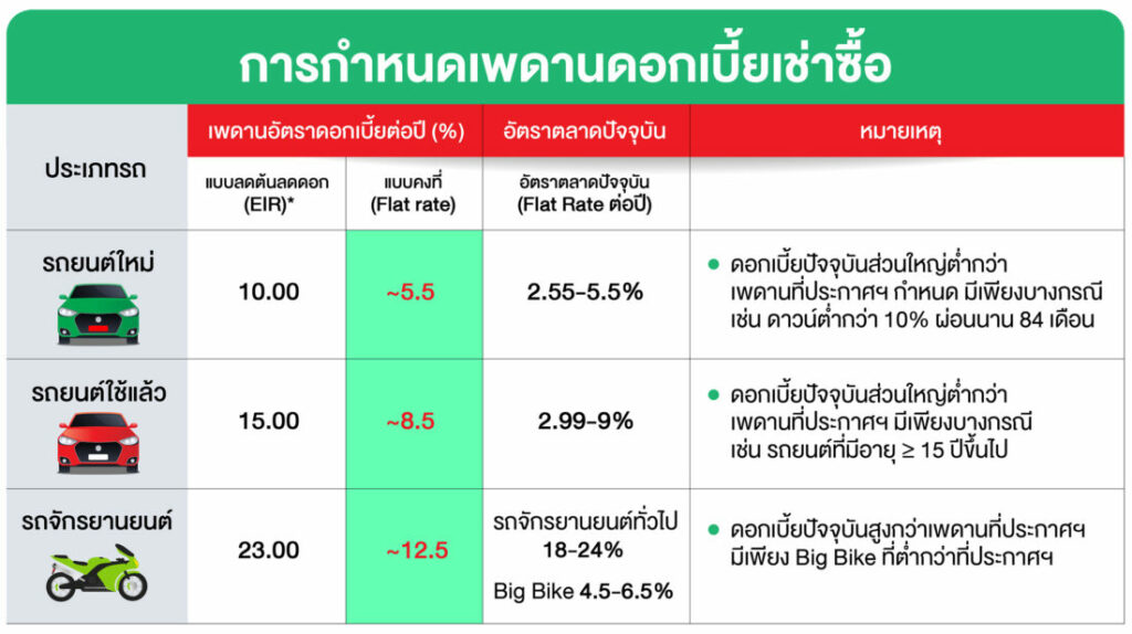 นายธีรชาติ จิรจรัสพร กรรมการผู้จัดการ ลีสซิ่งกสิกรไทย เผยว่า จากประกาศคุมสัญญาเช่าซื้อรถยนต์ สำนักงานคณะกรรมการคุ้มครองผู้บริโภค (สคบ.) ซึ่งจะมีผลบังคับใช้ตั้งแต่วันที่ 10 ม.ค. 2566 ที่ครอบคลุมเรื่องหลักที่เป็นประโยชน์กับผู้บริโภค เช่น การกำหนดเพดานดอกเบี้ยค่าเช่าซื้อรถยนต์แบบลดต้นลดดอก แบ่งตามประเภทรถยนต์ โดยรถยนต์ใหม่คิดดอกเบี้ยไม่เกิน 10% รถยนต์มือสอง 15% และรถจักรยานยนต์ 23%