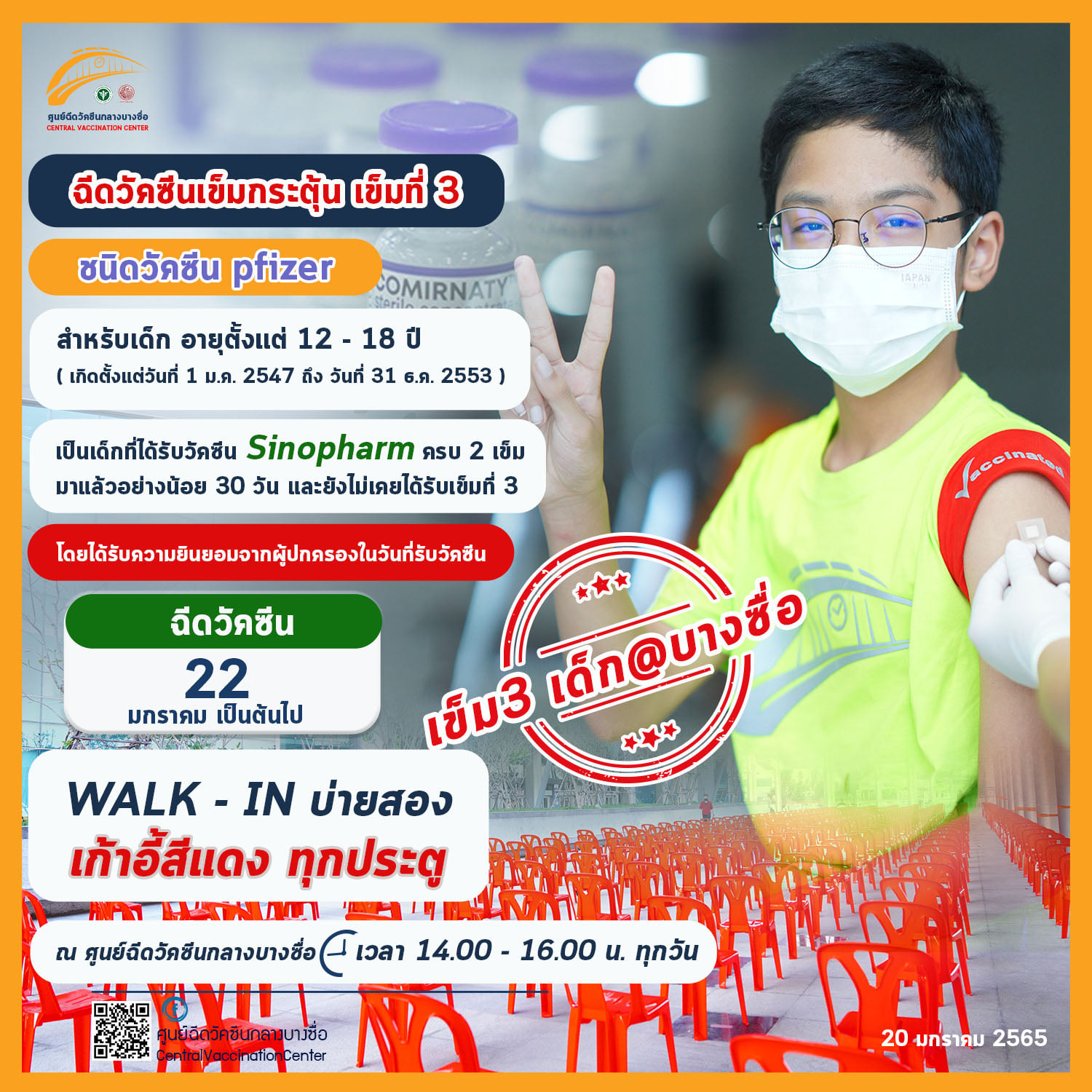 • เริ่มวอล์กอิน วันที่ 22 ม.ค. 65 เป็นต้นไป ทุกวัน ตั้งแต่เวลา 14.00-16.00 น.