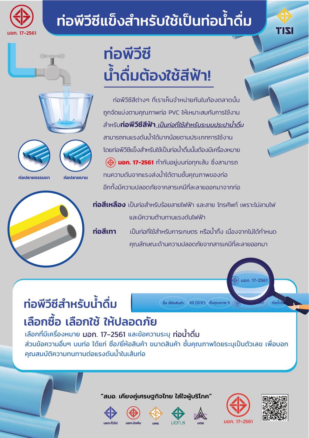 สมอ.เตือน ท่อน้ำดื่มต้องใช้สีฟ้า ตามมาตรฐานท่อพีวีซีแข็งสำหรับใช้เป็นท่อน้ำดื่ม มอก.17-2561 เท่านั้น หวั่นใช้ผิดประเภท มีสารปนเปื้อนเป็น อันตรายต่อสุขภาพ