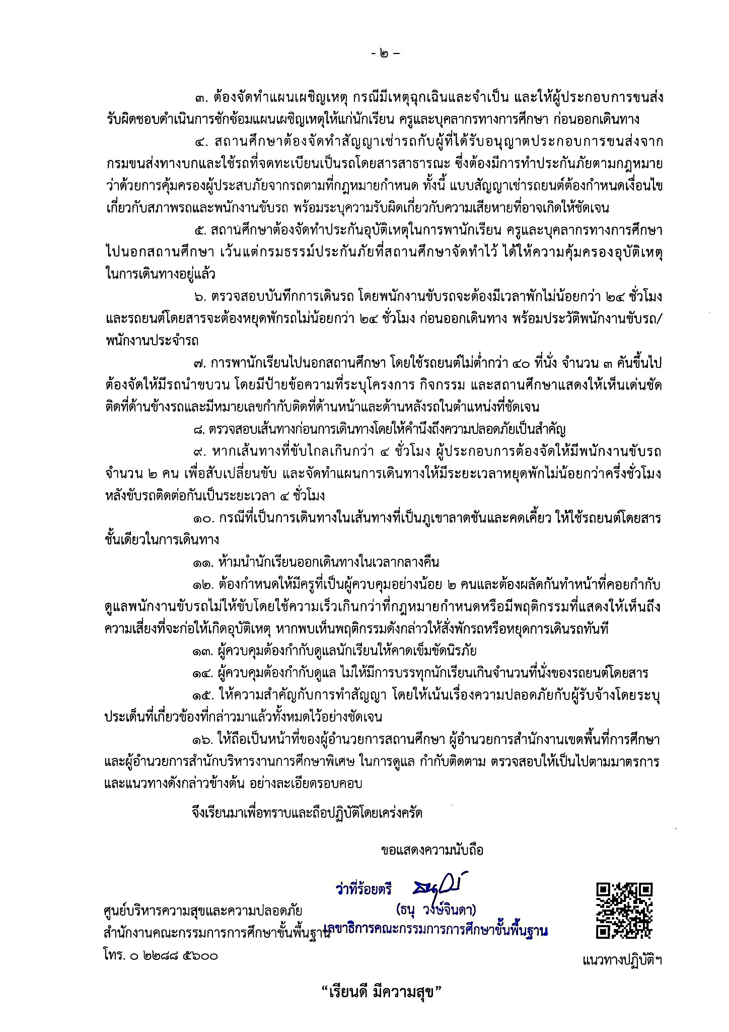 - การพานักเรียนระดับต่ำกว่าชั้นประถมศึกษาปีที่ 4 ไปนอกสถานศึกษา และการทัศนศึกษาควรมีผู้ปกครองร่วมเดินทางไปด้วย