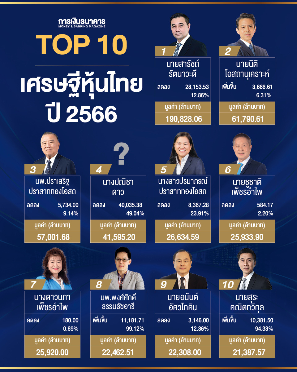 สำหรับผลการจัดอันดับเศรษฐีหุ้นไทยปี 2566 ใน วารสารการเงินธนาคาร ฉบับเดือนธันวาคม 2566 ปรากฏว่า