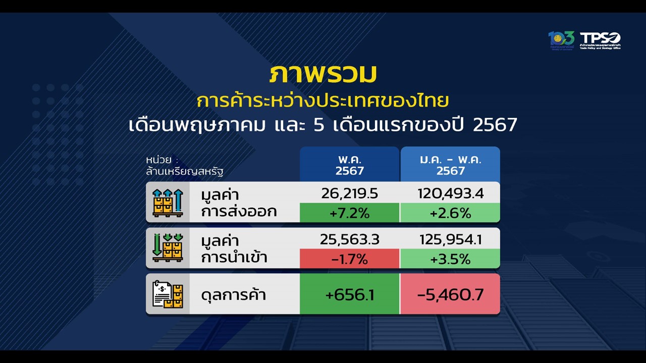 ส่วนยอด 5 เดือน ของปี 67 (ม.ค.-พ.ค.) การส่งออก  120,954.1 ล้านดอลลาร์สหรัฐ เพิ่มขึ้น 2.6% คิดเป็นเงินบาท มูลค่า 4.29 ล้านล้านบาท การนำเข้า  125,954 ล้านดอลลาร์สหรัฐ เพิ่มขึ้น 3.5% คิดเป็นเงินบาท  4.54 ล้านล้านบาท ขาดดุลการค้า 5,460.7 ล้านดอลลาร์สหรัฐ คิดเป็นเงินบาท  243,976 ล้านบาท