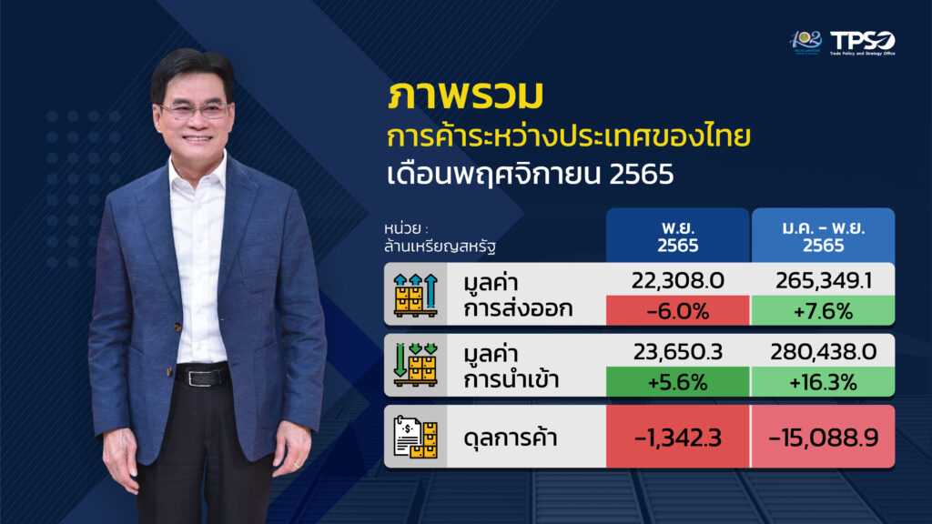 นายจุรินทร์ ลักษณวิศิษฏ์ รองนายกรัฐมนตรี และ รมว. พาณิชย์ เปิดเผยว่า ยอดการส่งออกเดือน พ.ย.65 มูลค่า 846,191 ล้านบาท ติดลบ 6% โดยเป็นการติดลบต่อเนื่อง 2 เดือนติด หลังจากเดือน ต.ค.ติดลบแล้ว 4.4% ส่วนการนำเข้าเดือนพ.ย.65 มีมูลค่า 23,650.3 ล้านดอลลาร์ ขยายตัว 5.6% ส่งผลให้ไทยขาดดุลการค้า 1,342.3 ล้านดอลลาร์สหรัฐ ขณะที่ภาพรวม 11 เดือนของปี 65 (ม.ค.–พ.ย.) มีการส่งออก 265,349.1 ล้านดอลลาร์ ขยายตัว 7.6% ซึ่งเกินเป้าหมายทั้งปี 65 ที่ตั้งไว้ 4% แล้ว ส่วนการนำเข้ามีมูลค่า 280,438 ล้านดอลลาร์สหรัฐ ขยายตัว 16.3% ขาดดุลการค้ารวม 15,088.9 ล้านดอลลาร์
