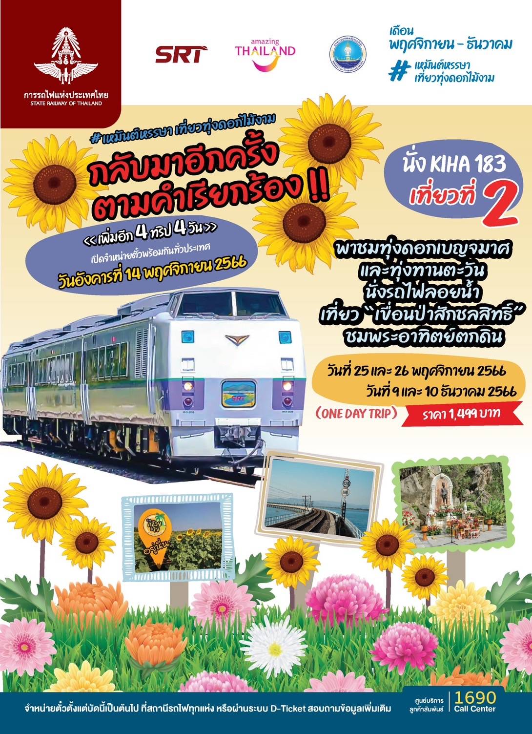 ดังนั้น เพื่อเป็นการสนองตอบต่อความต้องการของประชาชน การรถไฟฯ จึงได้จัดเพิ่มทริปขบวนรถพิเศษนำเที่ยว KIHA 183 เส้นทาง กรุงเทพ-เขื่อนป่าสักชลสิทธิ์ “พาชมทุ่งดอกเบญจมาศและทุ่งทานตะวัน นั่งรถไฟลอยน้ำ เที่ยวเขื่อนป่าสักชลสิทธิ์ ชมพระอาทิตย์ตกดิน” เป็นกรณีพิเศษ ในวันที่ 25 และ 26 พฤศจิกายน วันที่ 9 และ 10 ธันวาคม 2566 รวม 4 ทริป 4 วัน เพื่อเป็นของขวัญพิเศษให้กับนักท่องเที่ยวในโอกาสส่งท้ายปีเก่าต้อนรับปีใหม่ โดยเริ่มจำหน่ายตั๋วโดยสารพร้อมกัน วันที่ 14 พฤศจิกายน 2566 ตั้งแต่เวลา 08.30 น. เป็นต้นไป ราคา 1,499 บาท จำกัดจำนวน 200 ที่นั่งต่อเที่ยว ผู้สนใจจองตั๋วโดยสารได้ ที่สถานีรถไฟทั่วประเทศ และช่องทางการจำหน่ายตั๋วในระบบออนไลน์ D-Ticket สอบถามข้อมูลเพิ่มเติมได้ที่ ศูนย์บริการลูกค้าสัมพันธ์ หมายเลขโทรศัพท์ 1690 ตลอด 24 ชั่วโมง