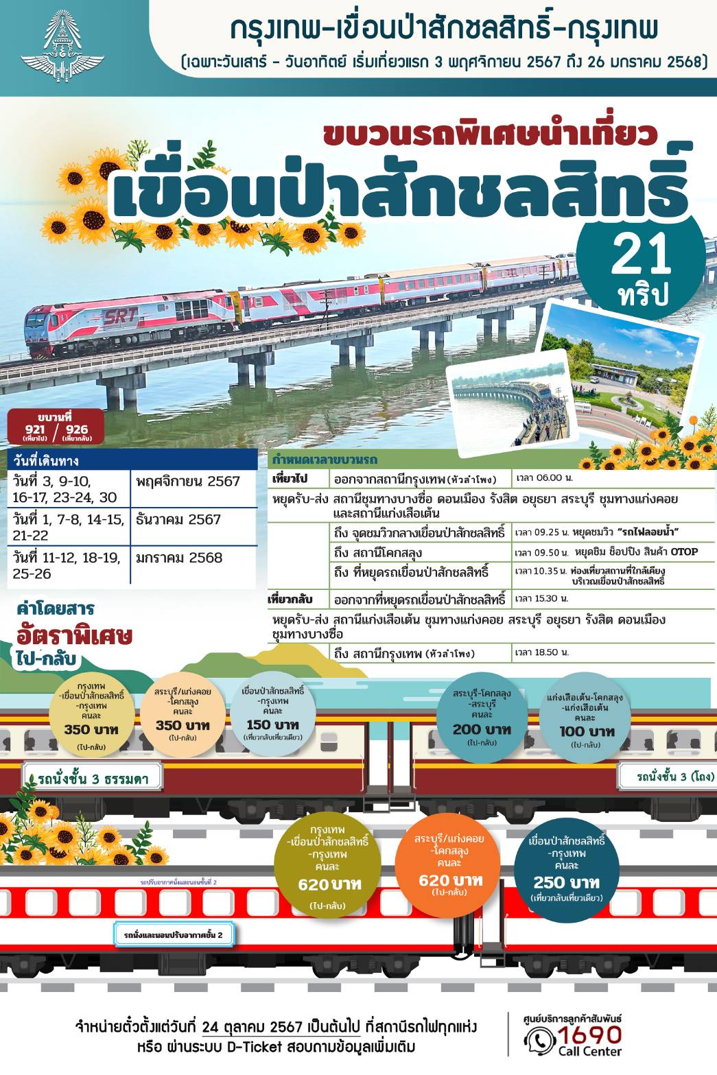 เตรียมจองตั๋ว!! ทริปนั่งรถไฟ “ลอยน้ำ รับลมหนาว ชมวิวกลางเขื่อน” กับขบวนรถพิเศษนำเที่ยว กรุงเทพ – เขื่อนป่าสักชลสิทธิ์ รฟท. จำหน่ายตั๋วพร้อมกันทั่วประเทศ 24 ตุลาคมนี้