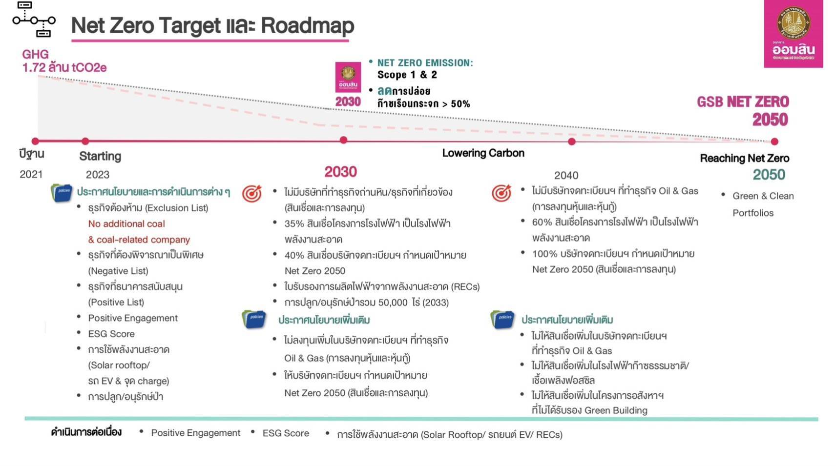 นายวิทัย รัตนากร ผู้อำนวยการธนาคารออมสิน เปิดเผยว่า  คณะกรรมการธนาคารออมสิน ได้อนุมัติแผนลดการปล่อยก๊าซเรือนกระจกสุทธิเป็นศูนย์หรือเน็ทซีโร่ อีมิชชัน โร้ด แมพ โดยได้กำหนดขอบเขตแผนงานเป็น 3 ระยะ เพื่อจัดการปริมาณก๊าซเรือนกระจกของออมสิน 1.72 ล้านตัน ซึ่งจะมีทั้งการลดปล่อยก๊าซเรือนกระจกจากการใช้น้ำมันเชื้อเพลิงและไฟฟ้า การงดให้สินเชื่อแก่ลูกค้าและการลงทุน ซึ่งจะดำเนินแบบคู่ขนาน เพื่อบรรลุเป้าหมายการลดก๊าซเรือนกระจกในภาพรวมได้มากกว่า 50% ภายในปี 2574 และมีคาร์บอนฯ เป็นศูนย์ได้ปี 2593