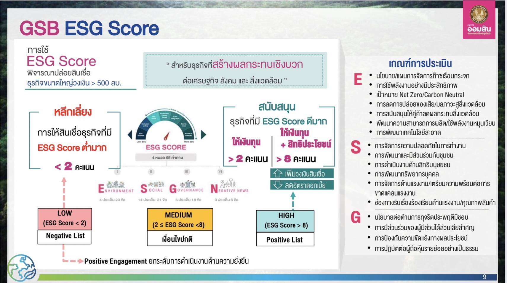 ทั้งนี้ ธนาคารออมสินเป็นผู้ริเริ่มกำหนดเป้าหมายงานด้านอีเอสจีที่ชัดเจน และได้นำเอาระบบ อีเอสจี สกอร์ มาใช้พิจารณาให้สินเชื่อเป็นธนาคารแรกของประเทศ ซึ่งได้พัฒนาร่วมกันกับหลายหน่วยงาน โดยแผนปี66 ได้เริ่มนโยบายและจัดกลุ่มธุรกิจที่จะสนับสนุนสินเชื่อและการลงทุนเป็น 3 กลุ่ม พร้อมกับเริ่มการใช้ อีเอสจี สกอร์ ประเมินคุณสมบัติด้านอีเอสจี ของลูกค้าวงเงินสินเชื่อ 500 ล้านบาทขึ้นไป ซึ่งผลคะแนนของอีเอสจี สกอร์ จะถูกนำมาประกอบการพิจารณาอนุมัติสินเชื่อ โดยหากอยู่ในเกณฑ์ดี 8-10 คะแนน ได้ส่วนลดดอกเบี้ย  หรืออนุมัติเพิ่มวงเงินสินเชื่อ ถ้าได้ 3-7 คะแนน จะให้สินเชื่อปกติ แต่ถ้าได้อีเอสจีสกอร์ ต่ำ 0-2% ก็อาจไม่ได้รับพิจารณาสินเชื่อเป็นต้น”