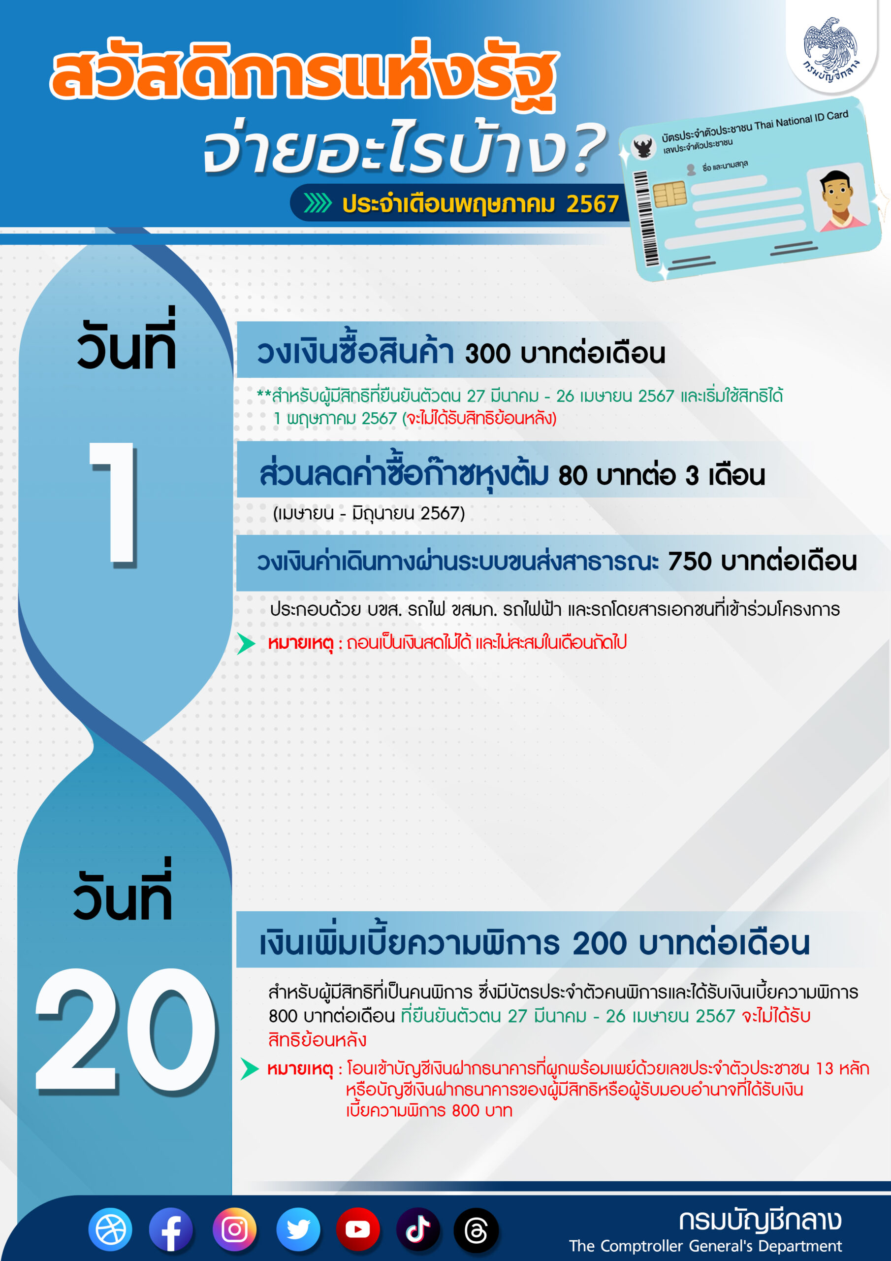 กรมบัญชีกลางอัปเดต บัตรสวัสดิการแห่งรัฐ รอบใหม่ เดือนพฤษภาคม 2567 แจกอะไร เงินเข้าวันไหนบ้าง  เช็กได้เลย