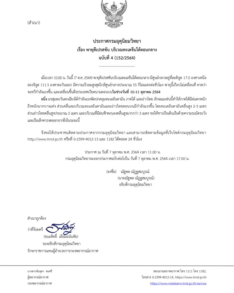 ผู้สื่อข่าวรายงานว่า “กรมอุตุนิยมวิทยา” ออกประกาศพายุดีเปรสชัน บริเวณทะเลจีนใต้ตอนกลาง ฉบับที่ 4  วันที่ 7 ตุลาคม 2564 โดยระบุว่า พายุดีเปรสชันบริเวณทะเลจีนใต้ตอนกลาง มีศูนย์กลางอยู่ที่ละติจูด 17.0 องศาเหนือ ลองจิจูด 111.5 องศาตะวันออก มีความเร็วลมสูงสุดใกล้ศูนย์กลางประมาณ 55 กิโลเมตรต่อชั่วโมง พายุนี้เกือบไม่เคลื่อนที่ คาดว่าจะทวีกำลังแรงขึ้น และเคลื่อนขึ้นฝั่งประเทศเวียดนามตอนบนในช่วงวันที่ 10-11 ตุลาคม 2564