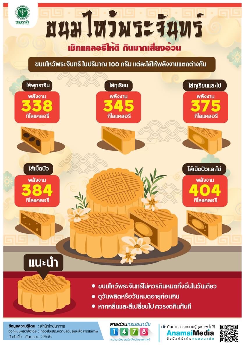 ผู้สื่อข่าวรายงานว่า กรมอนามัย ได้ให้ข้อมูลความรู้เกี่ยวกับ ขนมไหว้พระจันทร์ ด้วยว่า “เทศกาลไหว้พระจันทร์ เป็นเทศกาลของชาวจีนสำหรับระลึกถึงเทพธิดาแห่งพระจันทร์ โดยสิ่งที่ขาดไม่ได้ในเทศกาลนี้ คือ “ขนมไหว้พระจันทร์”ที่ใช้เป็นเครื่องเซ่นไหว้ แต่ขนมไหว้พระจันทร์มักมีแป้งและน้ำตาลเป็นส่วนประกอบหลัก อีกทั้งยังมีน้ำมัน น้ำเชื่อม และเมื่อมาผสมกับไส้ต่าง ๆ ที่มีรสชาติหวาน จึงทำให้เป็นขนมที่ให้พลังงานสูงมาก