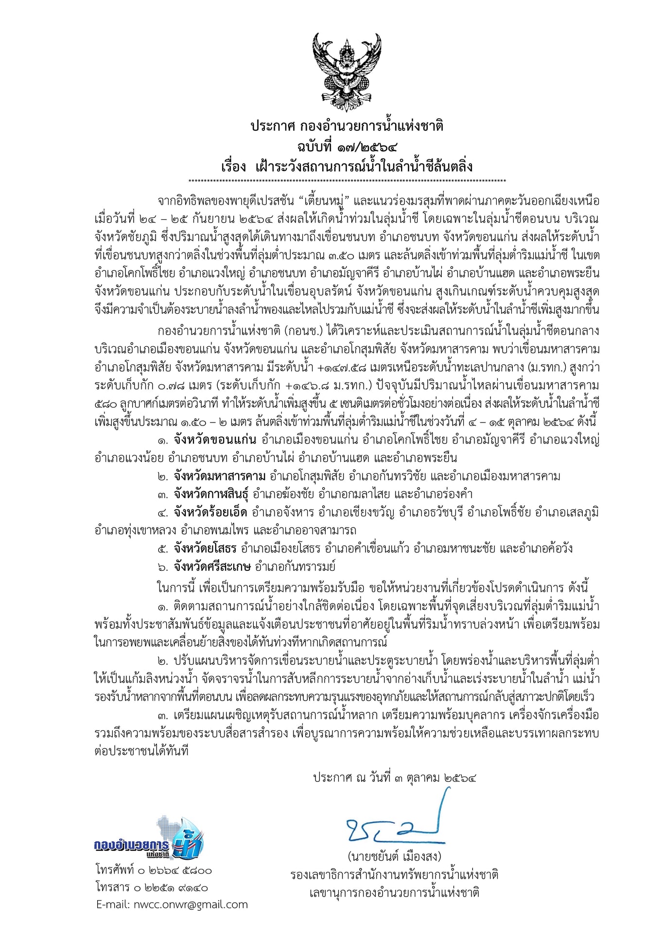 กอนช.ได้วิเคราะห์และประเมินสถานการณ์น้ำในลุ่มน้ำชีตอนกลาง บริเวณอำเภอเมืองขอนแก่น จังหวัดขอนแก่น และอำเภอโกสุมพิสัย จังหวัดมหาสารคาม พบว่า ปัจจุบันมีปริมาณน้ำไหลผ่านเขื่อนมหาสารคาม 580 ลูกบาศก์เมตรต่อวินาที และจะมีระดับน้ำเพิ่มสูงขึ้น 5 เซนติเมตรต่อชั่วโมงอย่างต่อเนื่อง ส่งผลให้ระดับน้ำในลำน้ำชีเพิ่มสูงขึ้นประมาณ 1.50 – 2 เมตร ล้นตลิ่งเข้าท่วมพื้นที่ลุ่มต่ำริมแม่น้ำชีในช่วงวันที่ 4 – 15 ตุลาคม 2564 ดังนี้