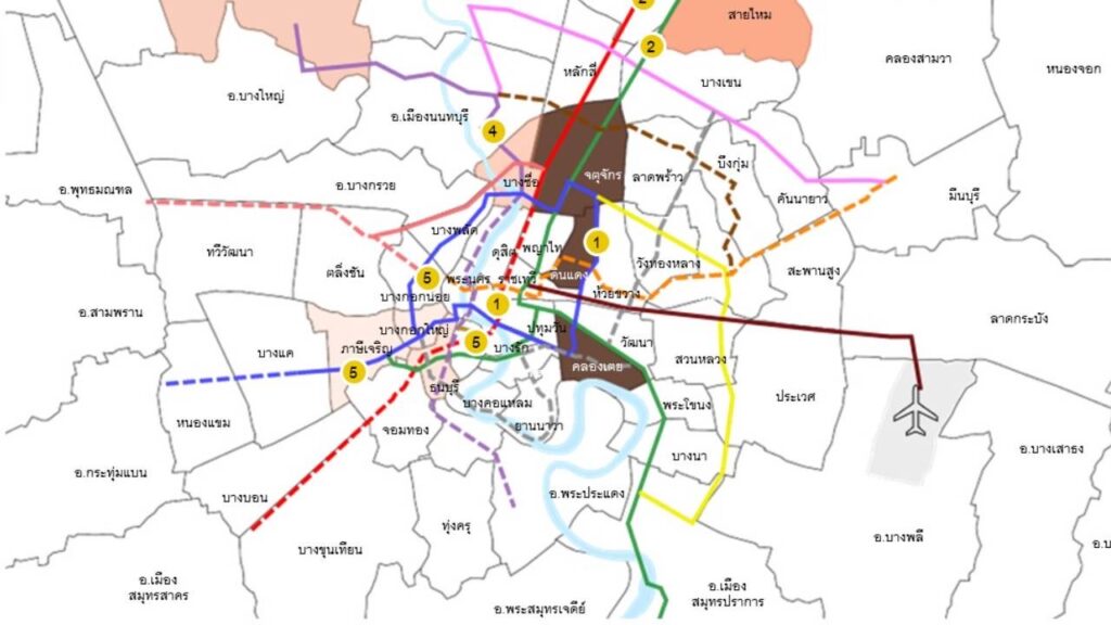 - อันดับ 5 ได้แก่ รถไฟฟ้าสายสีน้ำเงิน (หัวลำโพง-บางแค), รถไฟฟ้าสายสีทอง (ธนบุรี – ประชาธิปก) และสายสีส้ม (ตลิ่งชัน-ศูนย์วัฒนธรรม) โดยรถไฟฟ้าทั้งสามสายมีค่าดัชนีเท่ากับ 570.8 จุด 562.6 จุด และ 553.9 จุด ตามลำดับ แต่มีอัตราการขยายตัวของราคาที่ดินเพิ่มขึ้นเท่ากัน คือ ร้อยละ 9.2 เมื่อเทียบกับช่วงเดียวกันของปีก่อน (YoY) โดยราคาที่ดินในพื้นที่ภาษีเจริญ ธนบุรี และบางกอกใหญ่ ซึ่งเป็นพื้นที่บริการของรถไฟฟ้าทั้ง 2 สาย เป็นบริเวณที่มีราคาปรับเพิ่มขึ้นมากที่สุด