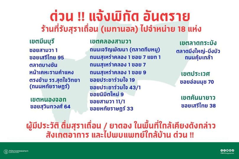 จากกรณีเกิดเหตุประชาชนดื่มสุรามีสารพิษทำให้มีผู้เสียชีวิต 2 ราย และมีผู้ป่วยเข้ารับการรักษาที่โรงพยาบาล 27 ราย หลังดื่มสุราที่ซุ้มยาดองบริเวณถนนหทัยราษฎร์ เขตคลองสามวา เขตมีนบุรี และบริเวณใกล้เคียง