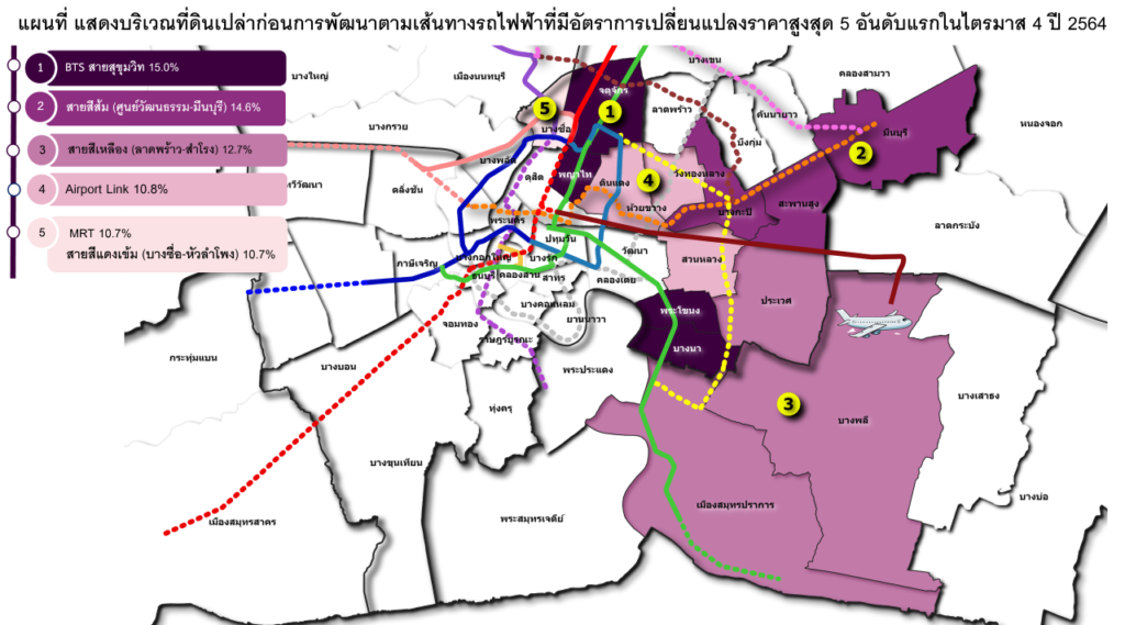 สำหรับราคาที่ดินเปล่าก่อนการพัฒนาในทำเลที่มีเส้นทางรถไฟฟ้าผ่านในไตรมาสนี้ พบว่า 5 อันดับแรกที่มีอัตราการขยายตัวของราคาที่ดินเพิ่มขึ้นสูงสุด
