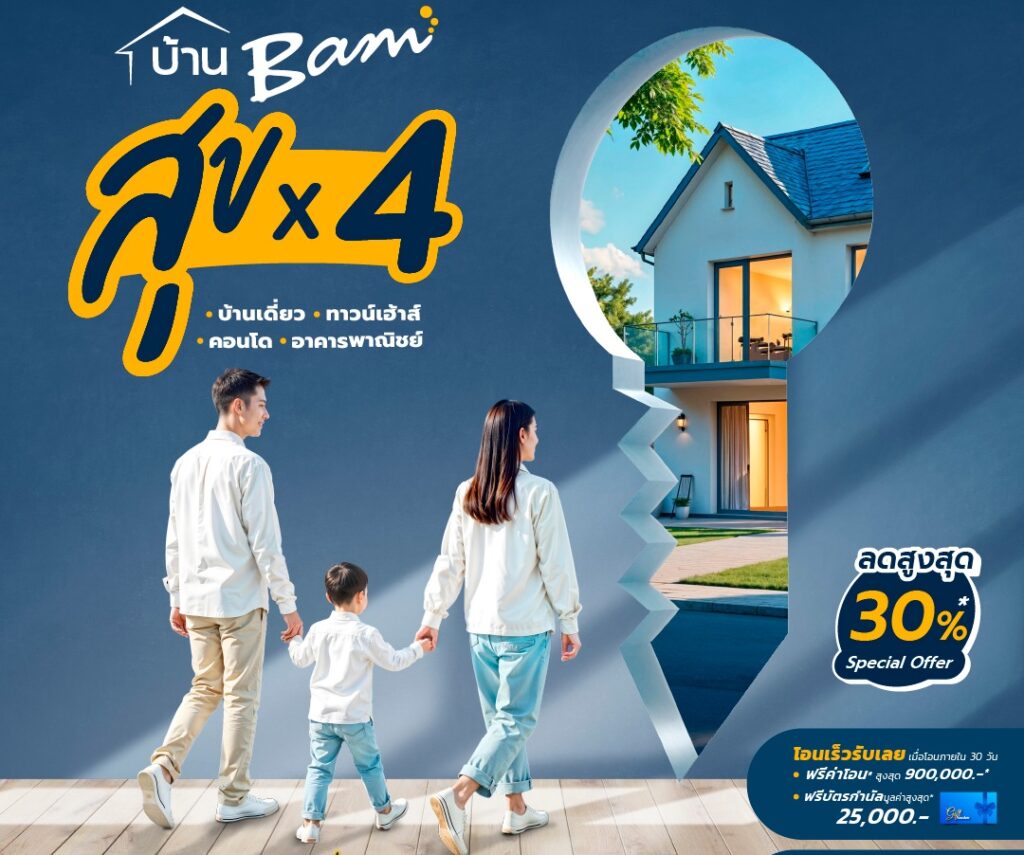 BAM จัดแคมเปญ “ บ้าน BAM สุข x 4 ” คัดที่อยู่อาศัยทั่วประเทศกว่า 2,300 รายการ ลดราคาสูงสุด 30 % ตั้งแต่วันนี้ ถึงวันที่ 15 มีนาคม 2568 พร้อมรับโปร “ โอนเร็ว รับฟรีค่าโอน”