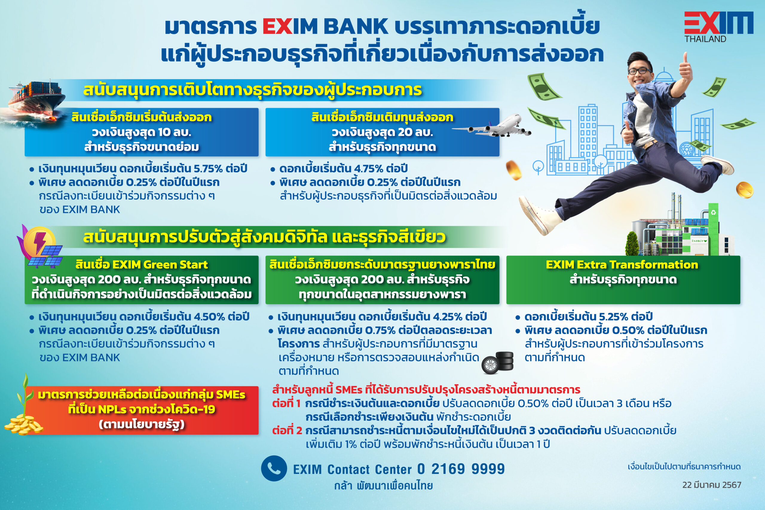 EXIM BANK พร้อมเคียงข้างและสนับสนุนผู้ประกอบการไทยให้มีสภาพคล่องในการดำเนินธุรกิจ บรรเทาภาระหนี้และต้นทุนทางธุรกิจ และปรับตัวให้สามารถแข่งขันได้อย่างยั่งยืนในเวทีการค้าโลกที่เต็มไปด้วยความท้าทายและโอกาสใหม่ ๆ ทางธุรกิจ สอบถามรายละเอียดเพิ่มเติมได้ที่ EXIM Contact Center โทร. 0 2169 9999 Email : contactcenter@exim.go.th